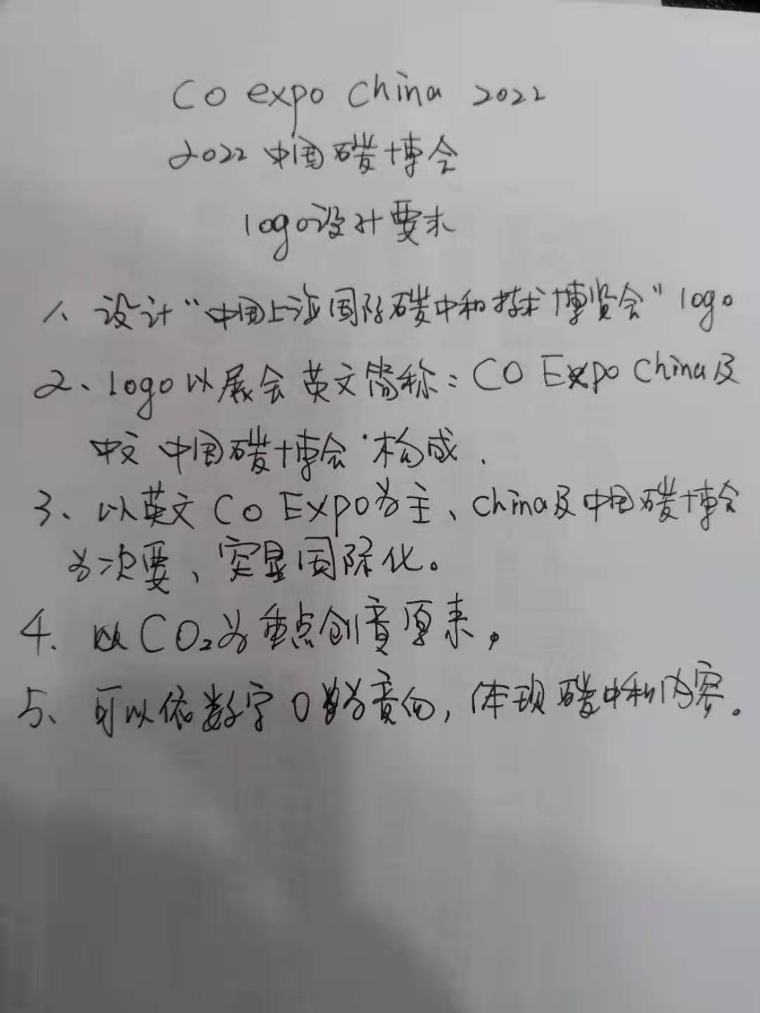 1、設(shè)計(jì)“2022”上海國際碳中和技術(shù)博覽會(huì)loge 2、loge構(gòu)成以展會(huì)英文“CO EXPO China 2022”和中文“2022中國碳博會(huì)”構(gòu)成 3、以英文CO EXPO為主、China及中國碳博會(huì)為次要,凸顯國際化 決要、實(shí)顯國院化。 4、CO2為重點(diǎn)創(chuàng)業(yè)元素 6、可以依數(shù)字O為意向,體現(xiàn)碳中和的內(nèi)容 7、可以用二種顏色體現(xiàn)碳“中和”的特性