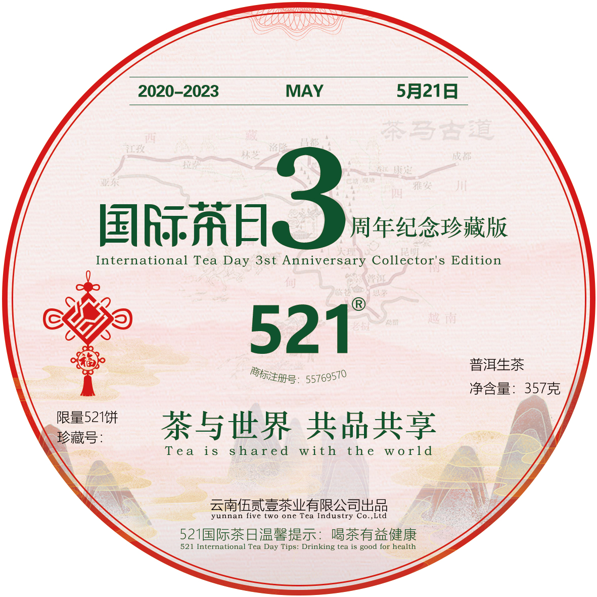 2019年12月19日第74屆聯(lián)合國大會通過決議,將每年5月21日定為“國際茶日”,應(yīng)“國際茶日”確立之契機,我公司注冊了521商標(biāo),并以弘揚中國茶文化為使命,刺激茶葉消費活力,促進(jìn)茶產(chǎn)業(yè)健康發(fā)展己任,深挖521品牌潛力,成就521品牌價值.......