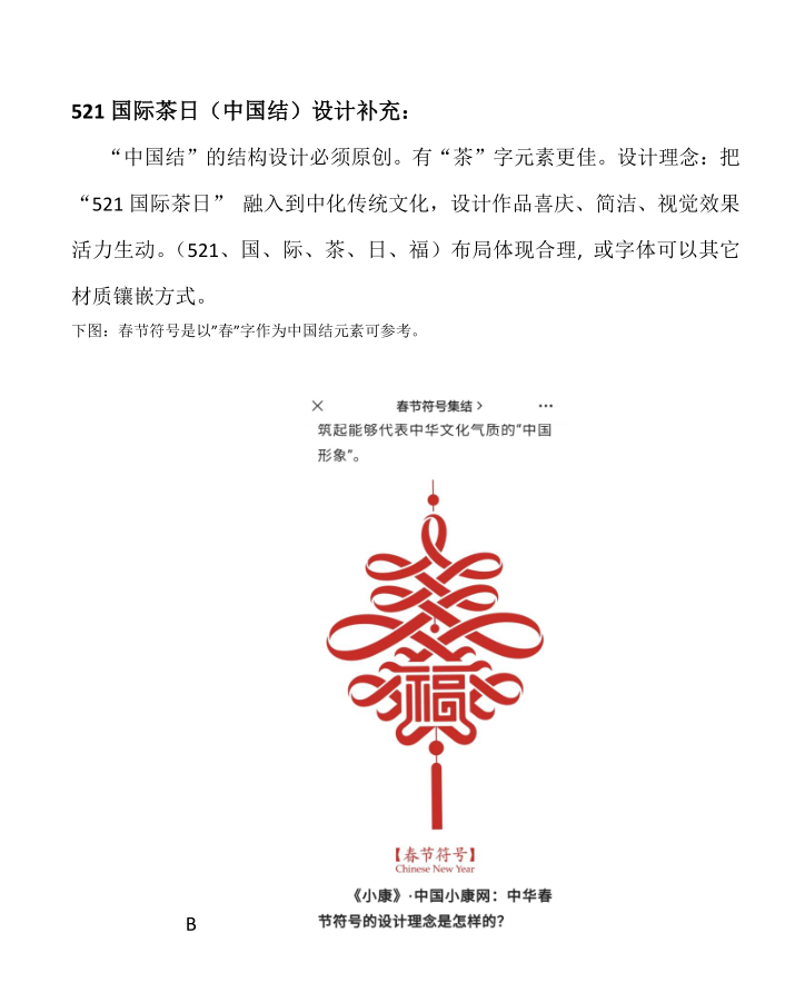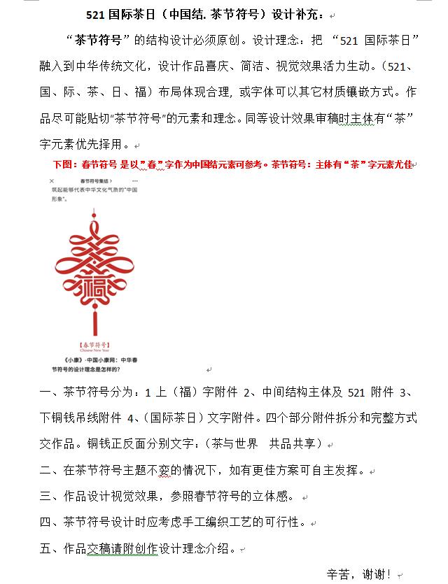 設(shè)計結(jié)合521國際茶日和中國元素、設(shè)計思想采用“中國結(jié)”作為logo(吉祥物)。 用絲繩編(視覺效果)織中國結(jié),主體分六個部分:中間凌形方塊編織成521數(shù)字、四個凌形角各生展四個小凌形方塊,每方塊內(nèi)分另編有“國、際、茶、日”四個字,上方的凌形角上方有土圓燈籠形,內(nèi)編有(福)字。最上部掛線、最下部一串梳線。(設(shè)計思路僅供參考)歡迎提供更佳方案。