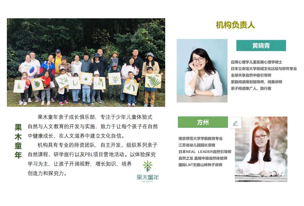 果木童年親子成長俱樂部,專注于少年兒童體驗式自然與人文教育的開發(fā)與實施,致力于讓每個孩子再自然中健康成長,在人文滋養(yǎng)中建立文化自信。