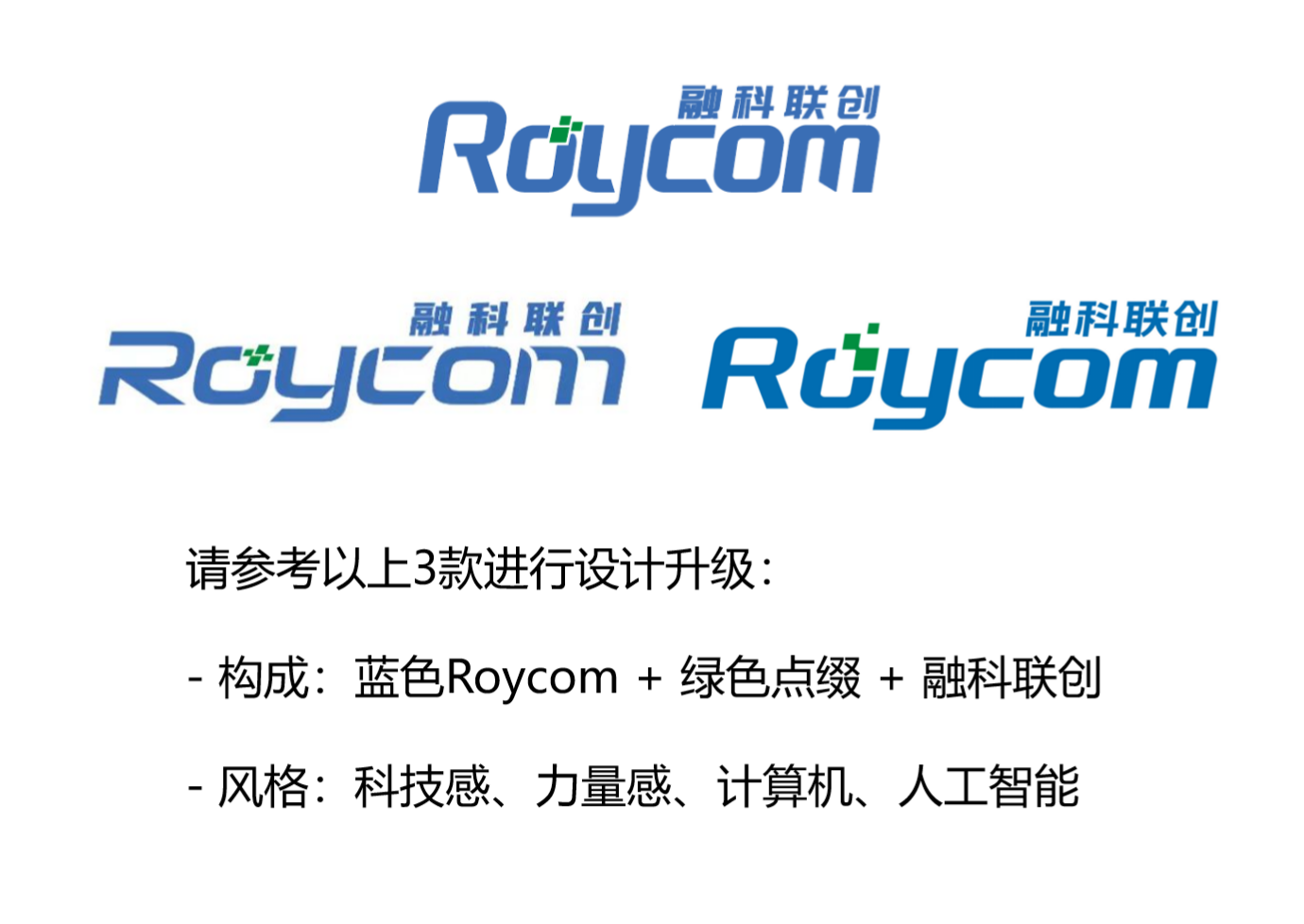 設(shè)計(jì)構(gòu)成:英文 Roycom 為主 + 中文 融科聯(lián)創(chuàng) 為輔 + 綠色點(diǎn)綴畫龍點(diǎn)睛 設(shè)計(jì)風(fēng)格:藍(lán)色為主、綠色為輔、科技感、力量感、計(jì)算機(jī)、人工智能 設(shè)計(jì)參考:之前設(shè)計(jì)過幾款都不太滿意,請幫忙再設(shè)計(jì)升級